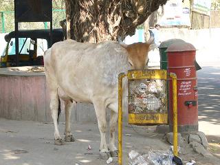 先日、ニューデリー市内のレストランでランチをした時のことです。お腹いっぱい食べて、さ~て車に乗りましょう、と、店の前の通りに出たところ、このような状況に出くわしました。大きな牛がなにやら真剣にゴミを漁っています。日本では、カラスによるゴミ荒らしが社会問題となっていますが、ここインドでは、牛がゴミを撒き散らしていても全くニュースになることもなく、人々は平然と横を通り過ぎていきます。このゴミ箱、まるで牛のエサやりのために設計されたように見えませんか?高さといい、大きさといい、まさにおあつらえ向き♪「不思議の国インド」を日々探索するマダムでした。