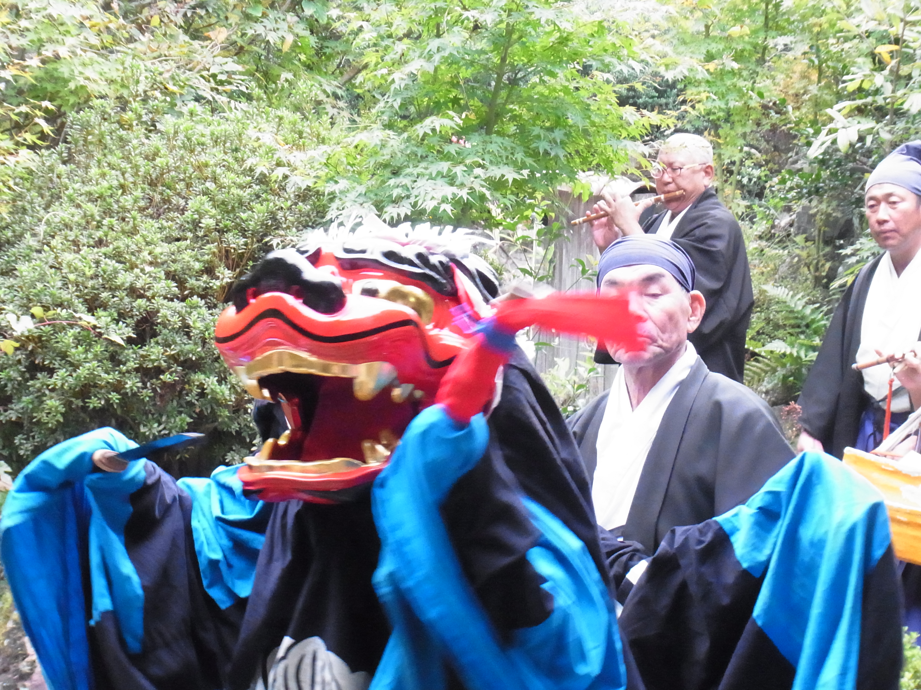 宴会もたけなわになった頃、当村恒例の豊穣と無病息災を祈念する伊勢神楽の門付けがこの日に当たったらしく巡って来て庭で2頭の獅子の舞と囃子を披露してくれたこともいい思い出となりました。