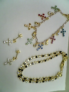 会社で同好会というのがあって・・私は手芸同好会なるものに入ってます。もともと不器用な私が手芸同会なんてちゃんちゃら可笑しいけど下手ながらもビーズでアクセサリーなんぞ作っているのさっ。で、キッドやらパーツなんかいっぱい買っているのに作成してないから、ゆっこちゃんと会社で作ろうって話になりました。ワイヤーで作るの物は超苦手なので・・ピアスやブレスレットを作ってみました。今、色んなパーツがあって付けるだけでも素敵なものが作れるのよね~。今回作成したのは上の三点。基本つけるだけでも、クロスのブレスレットは一個一個付けるのは結構大変だったかな。しかし、自分で作ると安く上がりますわ。また、次回も機会を作ってやろうと話しました。
