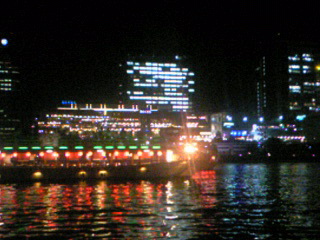 組合で毎年何かしらやるのだけれど(前回はディズニーシーに行ったのさ)今回は屋形船だよん。(8月の16日の出来事です)15名揃うと貸切になるだそうだ。浅草橋から乗船。物凄い暑い外とは違い冷房が効いてます(快適~!!)食事もなかなかウマウマでした。お台場までの道のりなかなかの景色。お台場についてしばしの停船。そこで熱々の天ぷらを頂きました。綺麗だね~。他にも沢山の船が出てました。前回のディズニーも楽しかったけど・・・いかんせん暑かった・・。屋形船は自分じゃ乗らないし、良い案でした。来年もお願いしたいものですな。