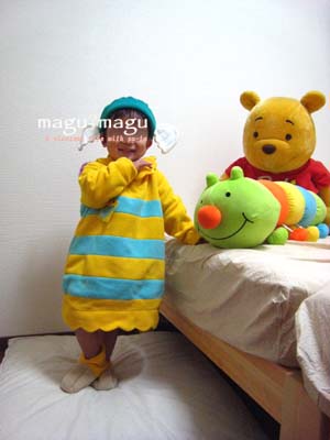 来月 NHKホールでおかあさんといっしょのファミリーコンサートがあるんですが、チケットはすごい競争率で、我が家は最初から諦めていました(^^;)ですが ここにきて ヤフオクにてわりと手ごろな値段で落札することができたんです(^^)定価プラスちょびっとくらい♪コンサート日は3日。 幼稚園が決まるのが2日なのでお祝いにもいいかなぁ~♪って思ってチケット入手したんです。(その幼稚園問題は今だ私を悩ませてるんですが、、、もうヤバイくらいに病んでます)チケット入手して ふとオークションをみるとスプーの着ぐるみなんて売ってる!!!サイズは100センチ!!!これは着ていくしかないんじゃない~?1000円でゲット!!!しかも新品♪(定価は5000円くらいみたい)それが今日届きました。早速着せてみることに♪ 萌え~~!!親ばかですが これはヤバイっしょ!!!(>▽<=)鼻血ぶー!!!!!(笑)可愛すぎるぅ~~~♪(←どこまでも親バカ)私が 「萌え~萌え~」言いながら写真撮りまくっていると、ぷー太「ぼえ~って なぁに?」私「ぼえ~じゃなくて萌え~!!可愛いってことだよ」ぷー太「ぷー太 ぼえ~」もう どっちでもいいよ(笑)(-m-=)ぼえ~~~!!!(爆)(萌え~)ハァハァ くだらない日記にお付き合いありがとうございましたm(__)m(笑)来週これ着せてコンサート行ってきまぁす♪幼稚園もはやく片付くといいです。