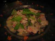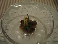恵比寿のちょっと分かりにくい場所にあるビストロです。私たちがはいった7時頃はすいていましたが、9時近くになって満席に! しかもなんとなく大人っぽい感じの人たちばかり。でも、それもそのはず、とってもおいしくていいお店ですよ。夜はアラカルトばかりです。まず前菜に、ずわいがにのクロケット。この料理好きです。久しぶりに食べられて感激! 写真はとったのですが、そんなに店内が暗かったという印象はないのに、なぜかカニのクロケットはほぼ真っ黒・・・(泣)。メインは、タルタルステーキ・・・ やっぱり黒いですね。真中に黄身で、ポテトが付け合せ。辛子をつけると、本当によくあっておいしかったです。デザートのバナナのタルトです。これも暗いですね。ちょっと固めでしたね。4人で、食前酒1杯ずつと、ワイン1本飲んで、6600円。量もたっぷりで、どれもおいしくて、雰囲気もいいです。