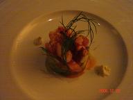 『東京最高のレストラン』(ぴあ)でみつけたお店。2005年の12月にできてたようです。場所は駒沢通り沿いで、わかりやすいですね。かわいい外観。本では、2800円のプリフィクスとなってましたが、500円値上げしたようで、3300円でした。それでも、十分安いと思います。メニューは「ビストロ前菜」「前菜」「メイン」に分かれていて、前菜、メインそれぞれから、1品ずつ選べます。 まずは、アミューズの冷たいラタトゥユ。本でも、ネットでも絶賛されていた、「前菜盛り合わせ」(+300円)、と「アボガドとえび」の前菜をいただきました。 うわさにたがわず、この盛り合わせはすごかったです。豚足や耳のゼリー寄せ、豚肉のパテ、キッシュ、スモークサーモン、鶏肉のリエット、いちじく、などなど、これとパンとワインさえあれば、りっぱな夕食になります。 そして、メインでまたやられました! このもち豚ときのこのローストのボリュームを見よ! 見ただけで、口あんぐりです。さすがに残しました。真鯛のローストは、まあ常識的な量ですね。ただ、どちらもちょっと味が濃すぎるようでした。特に魚は塩辛かった。もち豚も、これだけの量だと、きついですね。この値段は本当にりっぱですが、もう少し少なくてもいいので、素材をよくするとかしてくれたほうがうれしいです。パン、コーヒーもついてます。 おなかはいっぱいながら、デザートも当然お願いしました。チーズフォンダンのベリーソース。まあ、普通かな・・・ チーズムースですね。ビール2杯、赤ワイングラス2杯で、2人で9800円! このお値段は、感激です。
