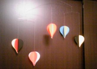 先日、出産祝いにいただいたコレ。 モービルです天井からつるして、ゆらゆら揺れるモチーフを娘が見て、少しでも一人遊びができればなぁと思い友達のSちゃんがお祝いに欲しいものない?って聞いてくれたのでリクエストしてみたら、こんな素敵な気球のモービルをくれました形はシンプルで、色はカラフルで、モチーフは厚紙でできてるので、万一落ちても危なくないし早速、天井からつるしてみたら予想以上に娘が喜ぶ喜ぶ風でゆら~んと動くたびにキャッキャと声を出して気球に向かってなにやらおしゃべり。。いつもはひとりあそびできてもほんのちょっとの時間しかもたないのに気づいたら1時間以上も一人で(気球と)あそんでましたついでに息子も気球に興味津々だったので息子はモービルを動かす係に任命(笑) 風がなくてモービルの動きが止まりそうになったら息子にうちわで風を送ってもらって娘はまたそれで喜ぶ・・・みたいな最近目がよく見えるようになってきた娘にはほんとちょうどよかったみたいですSちゃん、ありがとね~