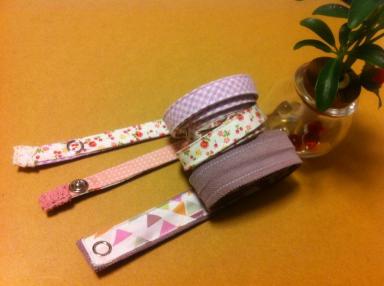 よく出先などで、ベビーカーやチャイルドシートに乗せた娘に、退屈しのぎにおもちゃを持たせるのですが、あそんでいてもすぐに落としてしまうので、そのたびに拾って渡すのも大変だし、特にベビーカーで移動中などはおもちゃをどこかに落としたまま気づかず…なんてことになったら嫌だなあと気が気でないことかよくあります。それで、おもちゃとベビーカーをつなぐ紐のようなものがあれば安心なのに…と思い、作ってみたのがコレです。 両端にスナップがついてるので、片方はおもちゃ、もう片方はベビーカーなどにつければ落とさずに済みます。 おもちゃだけでなく、おしゃぶりなどでもいけそうだし赤ちゃん用だけてなく、大人でも使えそうです。名付けてマルチストラップ。まぁ、ただのひもでもくくりつければわざわざ作らなくても簡単に代用できるのですがそれじゃなんだかつまらないし・・・どうせ作るなら好きな色柄のもので作ればテンションですよね。自分用に一本、イベント用に何本か納品できればなと思いつくりました。