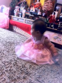 先日、娘の初節句のお祝いをしました両家のじいじ、ばあばに来てもらってみんなでお雛様を見ながらお食事。たいしたものは作れなかったのですがチラシ寿司やらおひなケーキやら、前日の夜から下準備をして(そんな日に限って、娘が夜泣きする・・・)なんとかそれなりに食事も用意できて、無事お祝いできたのですが終わってホッとしたのか、どっと疲れが出てここ数日は寝るのがめちゃめちゃ早い私・・・(笑)イベントの準備や息子の入園準備やら・・・やることはたくさんあるのに・・・体がなまりのように重いです・・・歳のせいか・・・?歳のせいにはしたくないけど・・・今晩からはまたがんばろうっと。 結婚式に着せたドレス、せっかくなので着せて記念撮影してみた・・・が娘、ドレスのすそをハムハムしてばかりでまともな写真はあまり撮れずでした