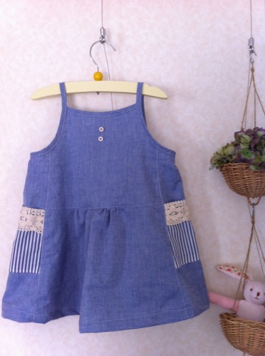 ということで・・・予告どおり(!)娘のワンピをUpします☆さっそくですがこんな感じです!前にUpした私のスカートと同じ生地C&Sの綿麻ダンガリーのブルーを使って♪パターンは「おしゃれでかわいい女の子服」の「レース使いのキャミソール」です☆サイドのポケットにはストライプの生地で切り替えを^^レースもたたいてみました~☆あと、少し寂しかったので前に飾りボタンをつけてこのパターン、すごく工夫してあって大好きなパターンです☆実はだいぶ前になりますが自分用のワンピもこのパターンの大人サイズで作りました。(去年の11月くらいにUpしてます☆)自分のはコーデュロイで作ったんですが生地が違えばまた印象ががらりと変わりますね~^^自分用のも春夏素材で作ってみようかなぁ~^^ということで、娘ワンピのUpでした☆明日は何がUpできるかなぁ~~ にほんブログ村