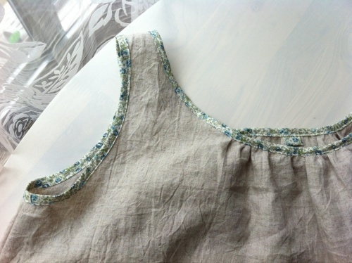 こんにちは^^現在、幼稚園の家庭訪問待ち・・・^^;一応玄関回りはきれいにして・・・ちょっと時間ができたので久々に作ったモノUpします!ってUpしきれるかな・・・。 最近、めっきりエンジン不調で、製作ペースがた落ち・・・><なんとかやる気をUpさせたいのですがなんだか気持ちがミシンに向かず・・・ほんとは納品用に縫い縫いスタンバイ中の子たちがたくさんなのですがなかなか手が伸びず・・・><気分転換になるかなと自分服を作ってみました。パターンはC&S FLORALより「ノースリーブチュニック」を丈25センチ伸ばしてアレンジ。生地は薄手のリネンで、襟ぐりと脇ぐりはリバティのエロイーズ、グリーンでパイピングしました☆前と後ろにたっぷりギャザーが寄っているだけで形はとってもシンプルなものなのでいろいろ合わせやすいかなと思います^^手持ちのサマーニットのカーデと合わせてみました^^これにさらにロールアップのジーンズ合わせたら絶対かわいいな^^♪ これでちょっとはテンション上がった・・・かな?!今晩からはまた納品用に手をつけられたらいいなぁ~~。。 にほんブログ村