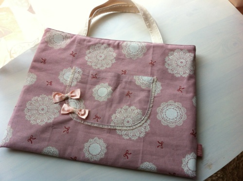 こんにちは^^今日はこんなものを作ってみたのでUpします☆ジャ~ン☆どうですか??(笑)なんかいつもの作風と違う!!って思ってくださった方。気づいてくださってどうもありがとうございます^^前にかわいい!と思って買ったまま寝かせていたこの生地をなんかかわいく形にしたいなと思い・・・いつもの作風を捨て(!)、小学生くらいの女の子が好きそうなテイスト(あくまで想像・・・笑)で作ってみました。写真ではわかりにくいかもですが表生地はピンク地にドイリーレースやリボンの柄。柄にはラメが乗っていてキラキラしてます☆そしてポケットにはフリフリレースをはさんでポイントにリボンを二つ。さらに持ち手にもフリフリレースをたたいて・・・。さらにさらに内布は白地にピンクのドットのキルト。このドットにもラメが乗っています☆完全に「姫」仕様です(笑)ピンク・リボン・レース・ラメ・フリフリ・キラキラ・・・と女の子の好きなワードがたくさん詰まったこのバッグ(笑)息子が今使っているピアノ用のレッスンバッグと同じサイズで作ったのでおけいこ事にもお使いいただけますよ~♪小さいころはママの好みの持ち物や服を文句言わずに身に着けていてくれたのがだんだん好みが出てきて、最近は黒×ピンク、フリフリのキラキラ・・・じゃないといやー!っていう女の子、私の周りにもたくさんいるので(笑)そんな女の子にも気に入ってもらえてかつナチュ系好みのママも「これくらいならまぁいっか」と許せる範囲・・・を目指して作ってみたのできっとそんな親子さんにも気に入っていただけるのではないかと思います(笑)こちらはCLEAR∴さんに納品予定☆納品しましたらまたこちらのブログ上でお知らせさせていただきます^^ 尚、遠方よりのお客様で、CLEAR∴さん店内販売作品についての、ご購入等のお問い合わせにつきましてはhandmade CLEAR∴: Tel : 078-381-9773: mail :cheebeeclear@yahoo.co.jpにて対応してくださるとのことなので、気に入った商品がありましたらどうぞお気軽にお問い合わせくださいませ♪ にほんブログ村
