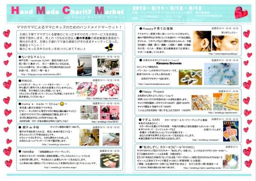 こんばんは^^久々に3日ほど、ミシンを触らない日々が続いていました^^・・・が昨日あたりからまた縫い縫い再開しています☆ まずは先日西宮フレンテにて行われたmiyamamaフェスティバル。ご来場くださった皆様、どうもありがとうございました☆私は作品のみの委託出展で、しかも当日はあいにくあそびに行くこともできなかったのですが1200人を超えるお客さまで大盛況だったようで^^出品した作品たちもたくさんの子たちが旅立っていったようでうれしい限りです。本当にありがとうございました☆ そして!次の参加予定イベントはこちら!「HandMade Charity Market」日時:2012年 5月11日(金)11:00~18:0012日(土)10:00~18:0013日(日)10:00~17:00会場:パルパローレビル地下1F(神戸市中央区元町通り3丁目)こちらのイベントは2010年から年2回開催されているそうでハンドメイドを通じて、お客様に喜んでいただき、その売り上げの15%を「愛の手運動社団法人家庭養護促進協会」さま への寄付にと・・・いった趣旨のイベントです。 上記画像をご覧いただければお分かりかと思いますがこちらのイベントはハンドメイドの販売スペースのほかにプチビューティー体験やセラピーコーナーなどがありハンドメイド以外でも十分にお楽しみいただける内容となっています♪ 私、main・gaucheも委託出品という形で参加させていただく予定です☆作品は「ちいさなマルシェ」ブースに置いていただきます♪ということで、納品までまたギリギリになりそうですが><がんばってモリモリ製作していきま~す^^今日はけっこうがんばってミニサイズだけどバッグを4つ仕上げました~。明日からまたパパがお休みなので製作スピードが落ちるかも・・・ですががんばります!!いつも応援のクリック、ありがとうございます☆ にほんブログ村