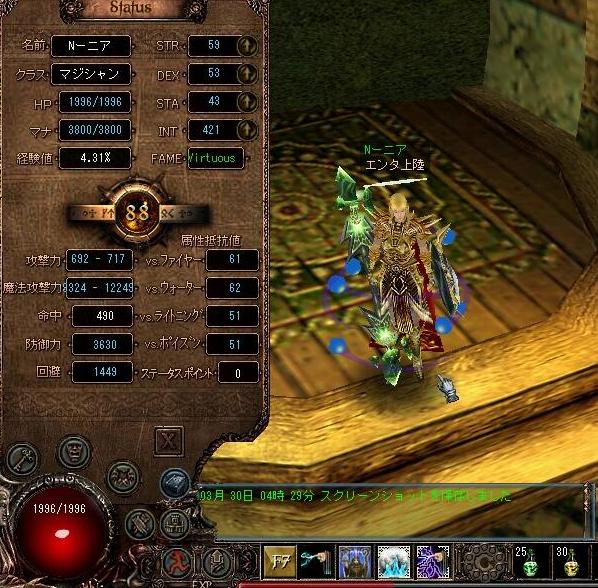 こんにちは~さて、育成をはじめた女性マジシャン N-ニア が85歳にヾ(〃^∇^)ノ図書館で80歳まであげるつもりが、78歳で死亡>_<;もう一度登るのもめんどくさいのでフレにてp(・∩・)q23時過ぎに80歳になり、24時の宇宙船で輪廻へε=ε=ヘ(;゜∇゜)ノ そのまま火炎橋・火炎奥と登録^-^b85歳セイク装備になったところで終了。。。。o(゜^ ゜)ウーンカワイイというかかっこよくなっちゃいましたb葡萄装備になったらどんなだろう?^-^?・・・といいかげんメインを動かしたいと思います^-^;そうそう『N-ニア』の名前ですが・・先日、映画を観まして・・・そうです『L change the WorLd』なかなかおもしろかったです^-^b 他にも『K-キラ』『L-エル』がいるので、そのうち登場するでしょう。