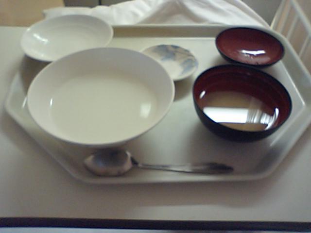 こんにちは~今日ついにご飯が出ましたヾ(〃^∇^)ノ明日検査の予定でしたが、今日に変更。結果のほうが良かったらしくbあと2・3日ご飯に慣れたら退院できるそうです^-^【今日のご飯】( ̄へ ̄|||) 白いお湯と茶色いお湯・・・小さいお皿は塩。これを30分間かけて食べてくださいと・・・普通のご飯が食べたい;_;徐々に硬いものを出していくそうなのですが明日のご飯はどんなんどろう?^-^?