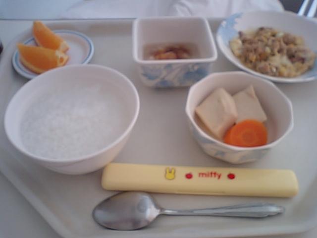 こんにちは~さて、今日のご飯は?^-^?白いお湯・ほうれん草入り味噌汁・豆腐・南瓜をつぶしたもの?スープ?・林檎。。。o(゜^ ゜)ウーン昨日よりずいぶんましですかね^-^;しかし・・・病院の食事なんてって思ってましたが、1週間食べてないとこれでもありがたいですm(._.)m 明日のご飯はもっと期待できそうです^-^