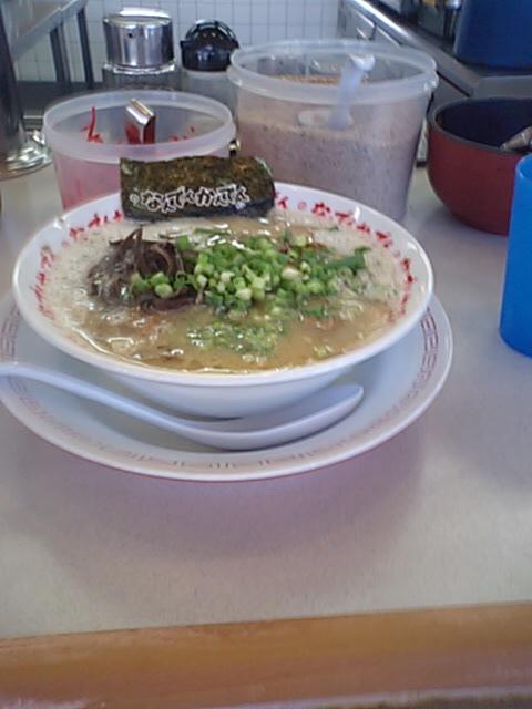 こんにちは~またまた、例のラーメンを食べにε=ε=ヘ(;゜∇゜)ノ 今回はぴんきちさんおすすめの『ねぎばかラーメン』ご覧のとおりねぎがいっぱいのっかってます^0^いつものようにスープはすごくこってり。麺の固さは粉おとし。おにぎり・替え玉1。おいしくいただきましたm( ̄○ ̄)mしかし・・・このお店。店内をもう少し綺麗にできないものか・・・靴のウラが油でツルツルです>_<;