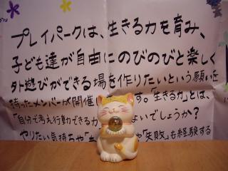 麗奈☆です。プレイパークとは、「自分の責任で自由に遊ぶ」をモットーに 自然の中での体験遊びが出きる場です。毎月1回、鶴見区の三ッ池公園の丘の上の広場で、火起こし体験、マシュマロ焼きやベッコウ飴作り、木にロープをかけてターザンロープやブランコ、ベイゴマ・ダンボール滑り台・ダンボールハウス作り・落ち葉プールなど 自分がやりたい遊びをする場所として 開催しています。その、プレイパークの案内チラシをロビーに用意いたしますので、是非御覧下さい。また、プレイパークの倉庫を購入する資金の募金も受け付け中です。募金箱として猫の貯金箱をロビーに置きますので、倉庫募金にご協力戴けると嬉しいです。皆様のご来場を 心よりお待ちしています♪