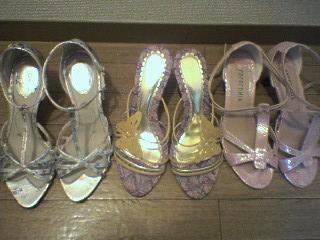 右もどっかのオリジナルでピンクにパールがかって、蛇の箔押し。足首を紐で結ぶタイプ。なんとかかとのゴムの替えがついている値段のわりに優れものです。
