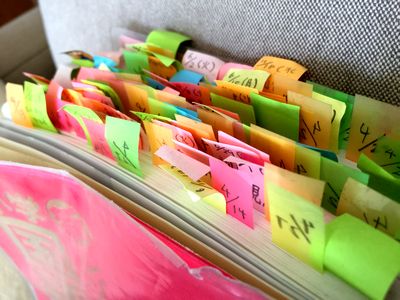 テキストの付箋がすごいのお声に。娘も辞書を引いたら付箋をぺたり。http://www.mmm.co.jp/office/post_it/jishobiki/index.html↑使い込むとこうなります。