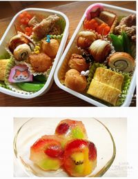 子供たちのお弁当。これにおにぎりを足して。デザートはいちご、キウイ、ぶどう、オレンジ、パインをレモンをしぼった寒天で包んでひとくちサイズに凍らせて。