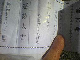 横浜に住んで初めて、近所の神社に初詣に行ってきました。イイタヌ夫は仕事、チクワを連れて行って「犬禁」だったら嫌なので、一人で行きました。イイタヌは前厄+大殺界らしいので、なんとしてもお守りをもらってきたかったのです。お参りを済ませ、おみくじも恐々ひいてみました。結果は…なんと大吉!人生で初です!前厄+大殺界だから、怖いのが出るかと思ったのに、嬉しい!…と思いきや、周囲からも「あ!大吉だ」という声。他の人のおみくじをチラリと見ても「大吉」…。もしかしたら、大吉しか入ってないおみくじだったのかもしれません…。よくある筒を振って棒を出すタイプのおみくじではなく、箱の中に直接手を入れてひいたし、果たして信用して良い物なのかどうか…。イイタヌは高校生の頃、大晦日~元旦に巫女さんのバイトをしたことがあり、おみくじを授ける係りも担当しました。参拝客が筒を振り、出てきた棒に書いてある番号のおみくじを渡すのですが、縁起の悪そうな四十九番はやはり「大凶」だったのを覚えています。四十九番をひいた人は、みんな「嫌な予感が…」とか「なんか縁起悪いな…」と言いながら、イイタヌからおみくじを受け取るのを待っているのですが、おみくじを開くと本当に大凶なので、イイタヌが選んだ訳では無いけれど、なんだか申し訳ない気になりました。誰でも、年の初めから「大凶」宣告を受けるより、「大吉」と言われたほうが希望をもって一年すごせるだろうし、たとえ「大吉」しか入っていないおみくじでも、これはこれで、ありがたい!という事にしておきます。今まで「大吉」をひいたことがなかったので、どうするべきか迷ったのですが、一応結んできました。「小吉」や「中吉」をひくと、慰めなのか「大吉より良いよ。大吉は大凶と表裏一体だから。」などと、よく親に言われたので念のため。もう、何が良いのかよくわかりません…。おみくじには、小さなお多福のお守りが付いていました。それと、厄除けのお守りも購入。両方お財布に入れておくことにします。素焼きのお皿は、お神酒を頂いた杯です。「ごちそうさま」と返そうとしたら、「持ち帰って、破魔矢などと一緒に神棚において下さい」と言われました。我が家に神棚は無いから、どうしよう…。トイレで塩を盛るお皿とかにしたら、ダメでしょうかね。(風水の本に書いてあったので、一応やっています。他の風水の決まりごとは、気になるけれど実践していません。)それか、アロマオイルを染みこませておくとか…。もう、何だっていいや…。