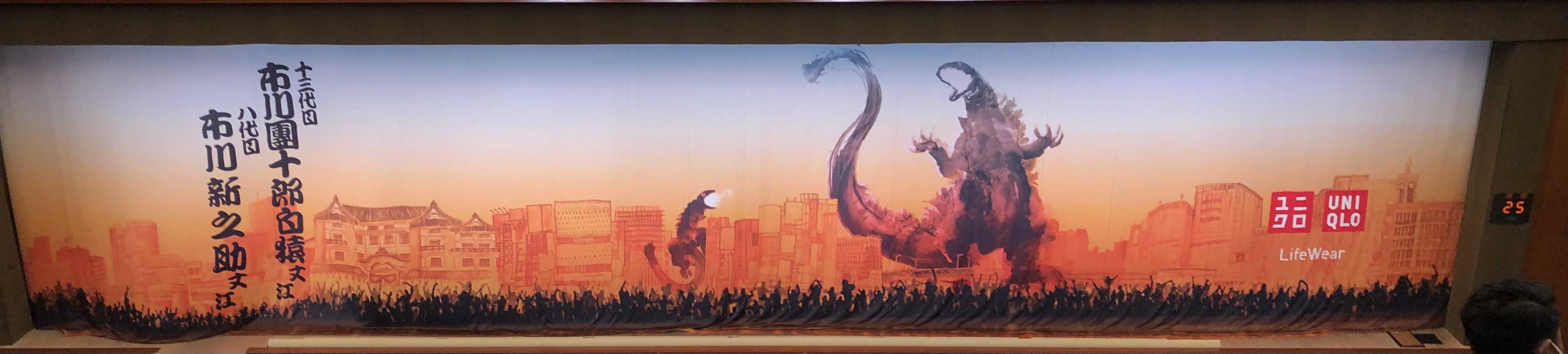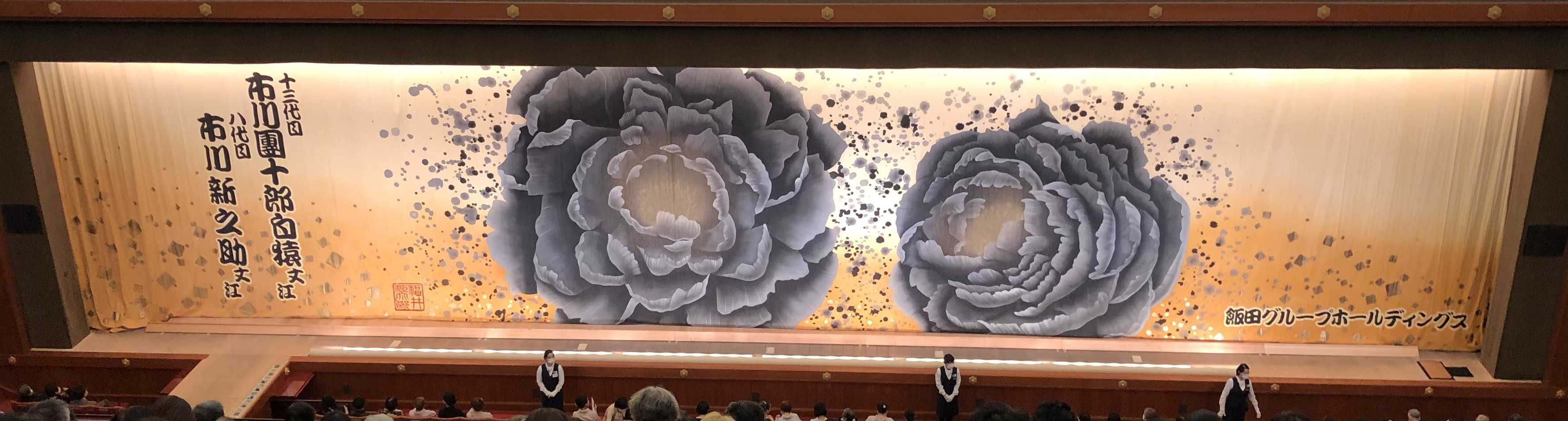 今月の襲名披露の祝い幕は飯田グループホールディングスさんが市川家の変え紋の牡丹