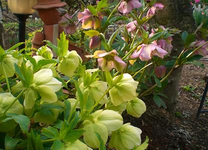 石楠花の木の木陰で。 何故か、みんな向こうを向いていますね。小高く土を盛り上げて、そのてっぺんに植えています。排水のいいように、との自分なりの考えです。 居間から見える場所で、エゴの木の下に、二種を植えています。 ドウダンツツジの木の下に四株が植わっていますよ。まだまだ、あちらこちらに。脈絡ないように見えて、これでも自分では、考えに考えて、植えています。 こんな風に、クリスマスローズが花盛り。 もう蕊がポロポロと落ち始めて、まわりの地面には、白いものがいっぱい。早や、芽を出し始めたものもあります。去年からのこぼれ種は、十センチくらいになり、それをまた庭の構図を考えて、植えなおしたりしています。実生は、二、三年後くらいには、花が咲く予定す。 クリスマスローズのいいところ。 まずは花期が長い。三ヶ月以上は咲いています。ほとんど水遣りはしないし、肥料も忘れた頃にあげる程度。こぼれ種で、増えていくし、興味があれば、交配して品種改良も。丈夫なので、植え替えをしても、全然大丈夫。こう数え上げれば、欠点がありませんね。何かあるかしら。