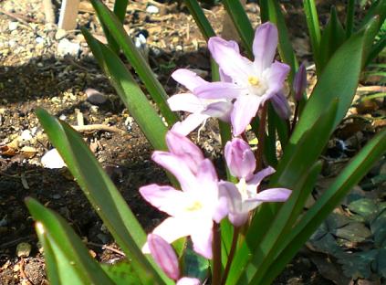 チオノドクサ。 雪の輝き、という意味だそうですよ。丈は15センチほど、球根ですが、植えっぱなしでもよく育ちます。毎年少しずつ増えて、15本ほどが咲いています。花期の短いクロッカスとは違い、半月くらい、楽しめるので、おすすめです。高山生まれなので、耐寒性はありますが、植えるときは、夏に木陰になる場所がいいですね。うちでは、モッコウバラの根元に広がっています。 先日、「趣味の園芸」ではクロッカスの増やし方をやっていましたが、花後の葉だけになったら、その葉をしっかり育て球根を充実させる。クロッカスは、球根の上に新しい球根ができるので、新しい球根を育てるには、腐葉土を深くかぶせる、と言っていました。 知らなかったので、あ~そうか、と嬉しくなり、そのうちに腐葉土を買ってこよう、と思っています。きっとチオノドクサも、同じような育て方をすればいいと思うので、腐葉土をかぶせてあげよう、と毎日が庭のことばかりに頭がいっています。 今朝の天気予報は、曇りのち雨でしたが、今は晴れています。午前中は日焼け予防をして庭仕事、午後は仕事をしましょ。