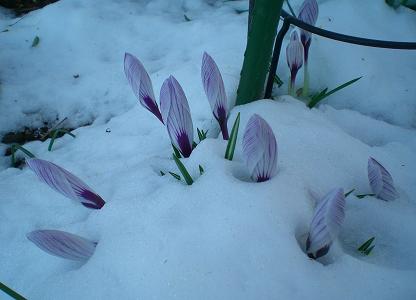 今朝の雪に埋もれたクロッカスです。奥の方へも、てんてんと続いています。まっ白なキャンバスに、ペンシルライトのような紫のクロッカスが、幾つも顔を出している様子に、思わず「きれい!」と叫びました。 残念ながら、目で見たようには、美しく撮れませんでした。 こんな雪の日でも、お客様は来て下さいます。私は、数年前のことですが、雪の日に、小路から大通りへ出ようとして、一旦停止で、ブレーキをかけたら、スリップして車が左右にゆらゆら揺れ出して、止まらなくなり、どうしよう!とぞっとしたことがあり、それ以来、雪の日は出来る限り、運転しないことにしています。その話をしたら、そのお客さんは、雪の日の運転が大好きなんですって。雪深い新潟の山奥の生まれだということでした。 ご自慢のフキノトウのお焼きを頂きました。緑々したフキノトウが、たっぷり入っています。娘さんが作っても、お嫁さんが作っても気にいらない。自分なりの微妙な粉の溶き具合があるそうです。 フキノトウも、若いのは苦いだけ、ある程度、穂の伸びたのがおいしい。まあ、食べてみて、と。ありがとうございます。私の食生活、お客様にいっぱい助けられています。