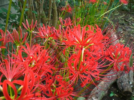 広やかな山をバックに、畑の畔に群がり咲く彼岸花。そんな光景が、とても似合う花ですが、私は、庭つづきの畑に植えています。毎年、株分けをくり返し、ブロック塀に沿って、五、六十本ほどに増えました。見れば見るほど、精巧なつくりの花ですね。 神様の職人技を見たような気がするのです。花は葉を見ず、葉は花を見ず、という言葉のとおり、葉の無い真っ赤な花が、まっすぐ立った茎の上に咲いている様子は見飽きません。 私は、歳時記を開くのが好きですが、見てみると、彼岸花は、圧倒的に多い数の俳句が詠まれています。それだけ、魅力のある花なんだな、と思います。それに、彼岸花、というより、別名の曼珠沙華、という方が似合うような。 さみどりの 直き茎よし 曼珠沙華 石田 波郷 白い彼岸花も咲いていますよ。 これはまだ全然増えていませんが。猛暑であろうと、冷夏であろうと、お彼岸にぴったり合わせて咲くのが不思議です。 ブログランキングに参加しています応援のクリックをよろしくお願いいたします。