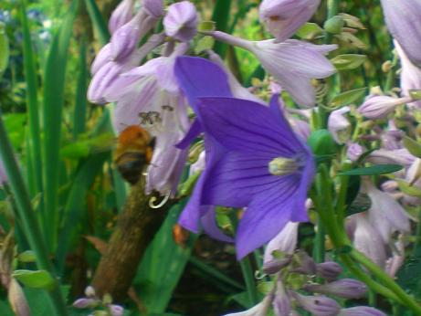 ギボウシの花が満開になり、葉っぱの上に、黄色の花粉が飛び散っています。あっ、マルハナバチがやってきて、ギボウシの花の中に、もぐりこみました。体に花粉をつけて出てきては、また次の花にもぐりこんでいきます。花の大きさは、蜂の体がすっぽり隠れる大きさです。 ギボウシの株が大きくなって、桔梗の領分を侵したのでしょう。キキョウが窮屈そうに、ギボウシの真ん中に伸びています。 宿根の庭の、奥深い土の中では、いろんな植物の根が入り乱れて、場所を確保しようと、生存競争をしているのでしょう。 ブログランキングに参加しています応援のクリックをよろしくお願いします。