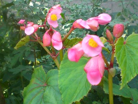 シュウカイドウです。毎年、地面一面に芽を出し、繁殖力旺盛です。決めた場所以外は、ぜんぶ抜き去ってしまいますよ。 一方、こちらは園芸品種のベゴニアです。こちらも、軒下の室外機のそばに、毎年こぼれ種で成長しています。同じ科に属する親戚だそうですが、よく似ていますね。 上がシュウカイドウ、下がベゴニアです。 今日は、娘の家がある地区のお祭りで、けっこう盛んなんです。地区別の太鼓のたたきあいもあり、パパもちょっと出るので、見に行くと喜ぶので行こうよ、といいます~(笑)暑いですが、気持ちを引き締めて、行ってきます! 二泊の予定です。 ブログランキングに参加しています応援のクリックをよろしくお願いします。