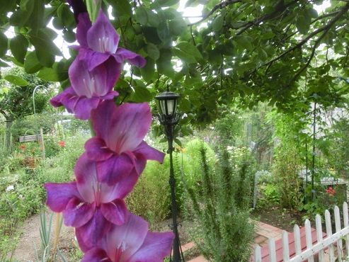 グラジオラスが咲き始めました。私の背丈以上の高さになり、今はまだ一本だけ咲いています。花の先端は、柿の枝の垂れ下がったところまで伸びて、グリーンの柿の実と、なにやら会話しているようです。植えっぱなしなので、小さな球根がいっぱい出来ているのでしょう、細かな葉がたくさん出ています。これでは、栄養が回らないでしょうに、よく立派に咲いてくれました。今年は、一度掘りあげて、大きな球根だけを残して植えなおそうと思います。隣では、メドーセージが大きく両手を広げて、暴れまわっています。花色は美しいですが、放任すると繁殖するので要注意です。ミニトマトが採れ始めました。紫蘇も、利用してください、と言います。トマト、紫蘇、と揃えば、ハイ!冷製パスタの出来上がり~。生ハムを入れたいところだけれど、冷凍庫に無かったので、スモークサーモンで代用。冷たくして食べました~。庭にあるもので食事が出来ることに感謝。 花ブログランキングに参加しています。 応援のクリックをよろしくお願いします。 昨日のアクセス数 1567 昨日のランキング 2 位