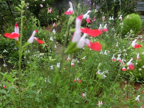 チェリーセージホットリップスです。いく年もこの場所で過ごし、いまや木のようになっています。まるで木の幹のようなごつごつした株には似合わず、咲く花は可憐です。赤と白の配分が絶妙です。可愛い!この子は、白の方が多いかな~。まったく赤の入っていない真っ白もありますね~。同じ仲間の、名前はよく分からずあやふやですが、サルビアピンク。これも可愛いですね~。なんでこんな傷んだ花を接写したのでしょう~(笑)ブログに取り込んでから気がつきましたが、撮り直しも面倒で、このままでゴメンナサイ。昨日はコボレタネの話を聞いて頂きましたが、今日も同じくコボレタネ。春ごろから、庭の管理の大部分が雑草取りに追われます。雑草は、大きくならないうちに、小さいうちに、懸命に取ります。そして、今日、気づきました!トレニアは、広範囲にコボレタネが芽を出しますが、トレニアの発芽する時期だということを全く忘れていて、全て雑草として取り除いてしまいました。このレンガとレンガに挟まれた通路に来て、この小さな緑が並んでいる様子は、どうも雑草とは違う、と気づきました。ここまで大きくなれば、トレニアと気づきますが、小さな双葉のうちは、似た雑草はたくさんあり、まったくわかりません。慌てて、ほかの場所をのぞき込んで探しましたが、やはり、全部取り除いてしまっていました。しまった!という感じです。でもまあ、トレニアの発芽力は強いので、まだこれからも出てくると思いますが。 花ブログランキングに参加しています。 応援のクリックをよろしくお願いします。 昨日のアクセス数 1626 昨日のランキング 2 位