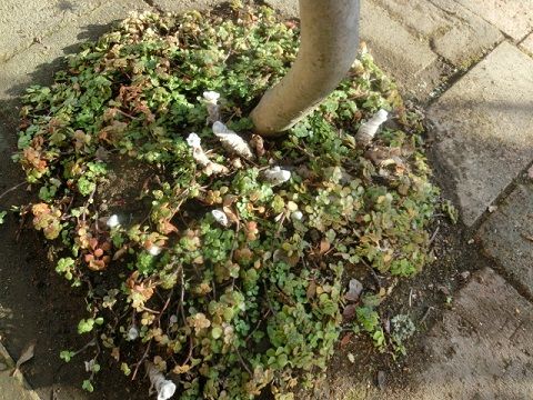 分かりにくい画像ですが、椿の樹の下のホワイトベルベットです。名前の知らない常緑のプランツに囲まれて、点々と白い頭が見えています。そばに近寄ると、こんな感じです。ホワイトベルベットの名前のとおり、全体が白い毛におおわれています。これは、十月ころの花の咲いているホワイトベルベットです。ツユクサ科なので、露草に似ていますね。茎が枯れてしまう頃、三本を折り取って、コップの水に挿しておきました。二週間ほどで、芽が出てきました。コップから出してみると、白い根も。こんなふうに、とても簡単に芽や根を出して、簡単に増やせます。根が出ているのを、鉢植えにして、廊下温室へ。春になったら、また地植えにしてもいいし、このまま育ててもいいし。勿論、一枚目の写真のも、春には茎を伸ばし花を咲かせます。 花ブログランキングに参加しています。 応援のクリックをよろしくお願いします。 昨日のアクセス数 1752 昨日のランキング 2 位