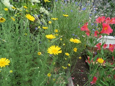 ダイヤーズカモミールです。ハーブではありますが、カモミールのように、香りはありません。とても丈夫で、コボレタネであちこちに、芽をだします。ブラックベリーの花との共演。ブラックベリーのフェンスのまわりに、とくによく芽を出しています。フェンスの裏側から、庭を覗くとこんな感じ。名前にダイと付いていますが、これは、dye 染める という意味で、染色に使うことができます。花をドライにしてから、煮出して使います。ミョウバンで、鮮やかな黄色に染まります。今年は、やるかどうか分かりませんが、ドライフラワーにはしたい、と思っています。早々と咲いているのもあるし、まだ10cmくらいのものもあります。葉も、涼し気な色と切れ込みが入り、たくさんの芽が出ていても、抜く気がしないほどのお気に入りです。コボレタネで育つ、と書きましたが、宿根するのもあり、宿根したものが早や花を咲かせているのでしょう。 花ブログランキンに参加しています。 応援のクリックをよろしくお願いします。 昨日のアクセス数 2029 昨日のランキング 3 位