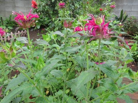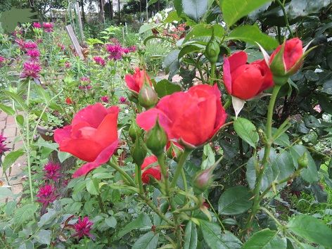 ベルガモットが群生して咲き始めました。多年草で、大体同じ場所に出てきます。これは濃いピンクですが、すこし遅れて、これから白色も赤色も咲き始めます。葉だけを見ても、色の区別がつかないので、それぞれを少し離して、植えてあります。花びらの先がとんがっていて、それが広がって放射状に咲く姿は、別名「タイマツソウ」が納得させられます。花が咲き進むと、真ん中からまた茎が立ち、二段構えで花が咲きます。例年は、この二段になる確率は、一割くらいだったのに、今年はなぜか、八割が、真ん中に緑色の蕾が出ています。不思議~、何でかな、と調べましたが、分かりませんでした。ベルガモットに囲まれて咲いているのは、薔薇ホットココア。何とも言えない黒っぽい赤が大好きです。雨に打たれて、頭がとっても重そう~。これからが本番なので、晴れた日に、また再登場させましょう。 花ブログランキンに参加しています。 応援のクリックをよろしくお願いします。 昨日のアクセス数 1931 昨日のランキング 3 位