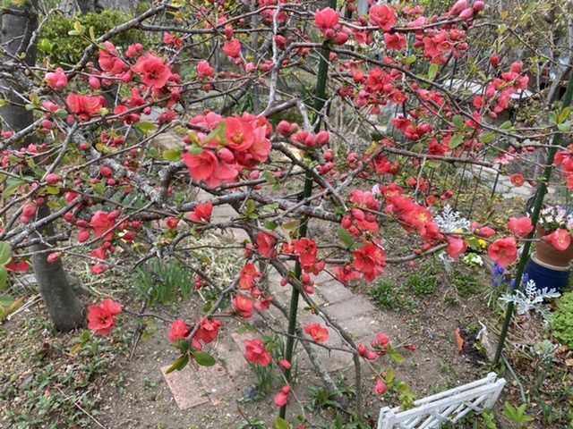 ボケの花。時々、小雨が降る曇った空だから、余計に赤い花が、くっきり映えて美しいな。バラ科ですって。分かる気がします。足元には、白い水仙。違う場所にも。名前は分かりませんが、違う種類です。庭仕事を終えて、やれやれと居間から外を見ます。おっ! 鳥が水を飲みに来ています。分かりますか? 向かって左上ですよ。アハハ、可愛い!バードバスの小さなアイアンの鳥と、親子みたい。先日から、もう一回り大きなバードバスが欲しいな、と、じつは思ってはいるのですが。 花ブログランキングに参加しています。 応援のクリックをよろしくお願いします。 昨日のアクセス数 1764 昨日のランキング順 6 位