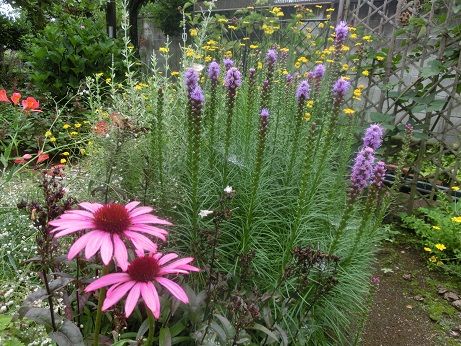 リアトリスの周辺の景色です。手間にエキナセアとペンステモンハスカーレッド、奥にはダイヤーズカモミール、左は、カスミソウとアルストロメリア。とても丈夫な球根植物。一度もいじらず植えっぱなしです。今年は、株分けしようかな、と思っています。こんな風に、上から順に咲いていきます。面白い形の花ですね。これでキク科だそうです。先日行った和食のお店へランチに行ってきます。日替わりメニューなので、先日は満足しましたが、今回は違うメンバーで行くのですが、さてどうでしょうか。楽しみです。いつもおばさんたちの厳しい批評に晒されて、こんなお店も、毎日が切磋琢磨で、大変なことでしょうね。 花ブログランキンに参加しています。 応援のクリックをよろしくお願いします。 昨日のアクセス数 4282 昨日のランキング 3 位