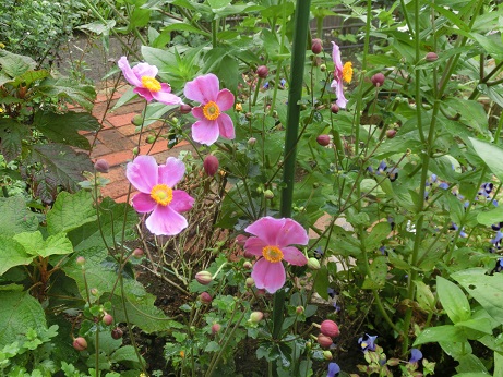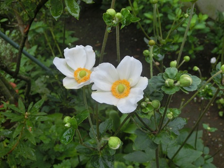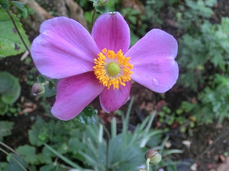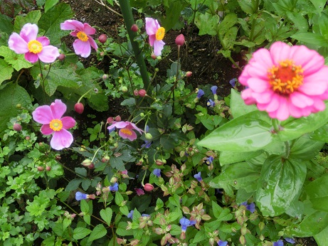 違う場所のこちらのシュウメイギクは、賑やかな花仲間に囲まれて、