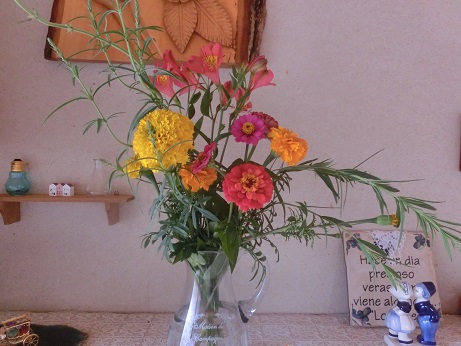 アフリカンマリーゴールド、百日草、アルメリアを花束にして、