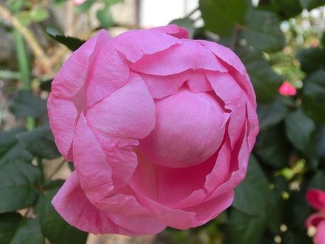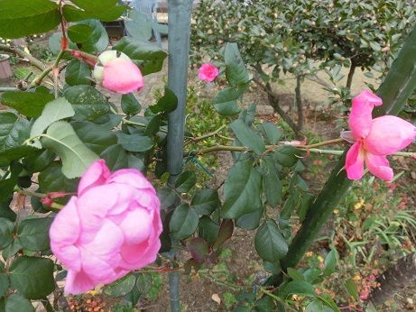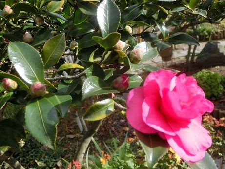 すぐ後ろに、自分も薔薇の仲間のような顔して、椿が一輪開花。