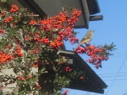 最後にピラカンサの木に止まり、赤い実を口にくわえました!