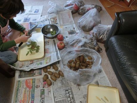 マイ包丁、マイエプロン持参の友人が、皮剥きに励んでいます。