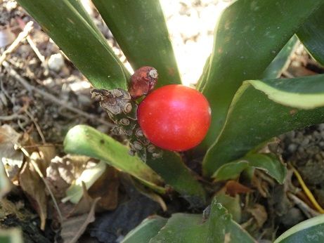 地面には、万年青(オモト)が赤い実を付けていました。