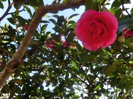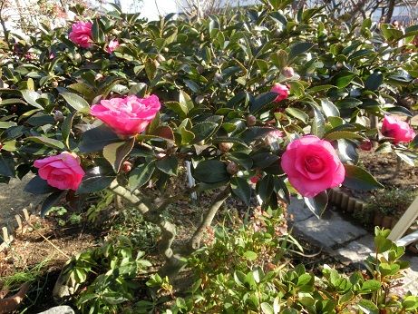樹の全体を丸くして、てっぺんは、まったいらに剪定してある椿です。