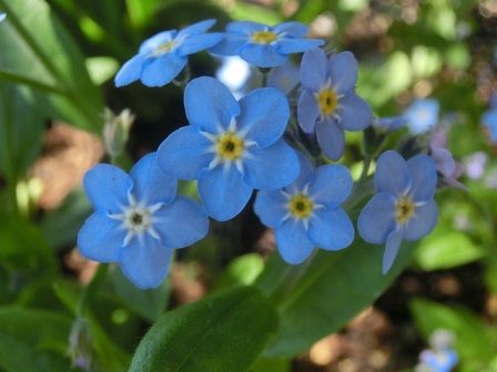 ワスレナグサが、木漏れ日を浴びてきらきらと輝いています。