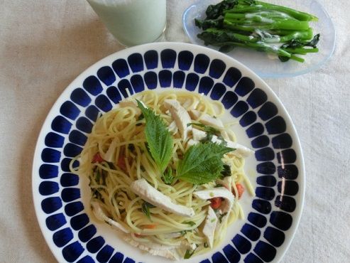 紫蘇、鶏胸肉、ミニトマトを使った冷製パスタ。