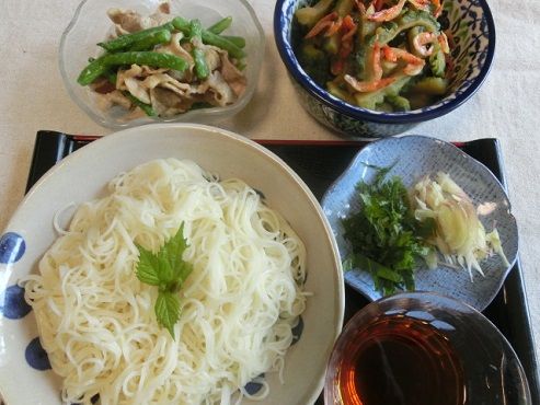 そうめん、豚肉とインゲンの練りごま和え、ゴーヤの佃煮。