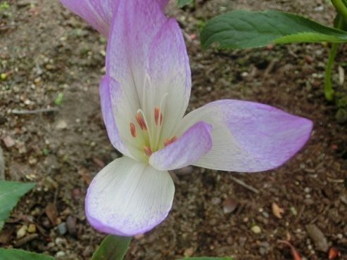 球根植物のコルチカムの花が、にゅ~と地面から出てきました。
