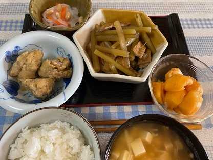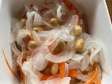 玉葱酢漬け、アジの甘酢(生協)、蕗の煮物。