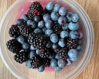 作っておいた牛乳プリンに、ブラックベリーの汁を、